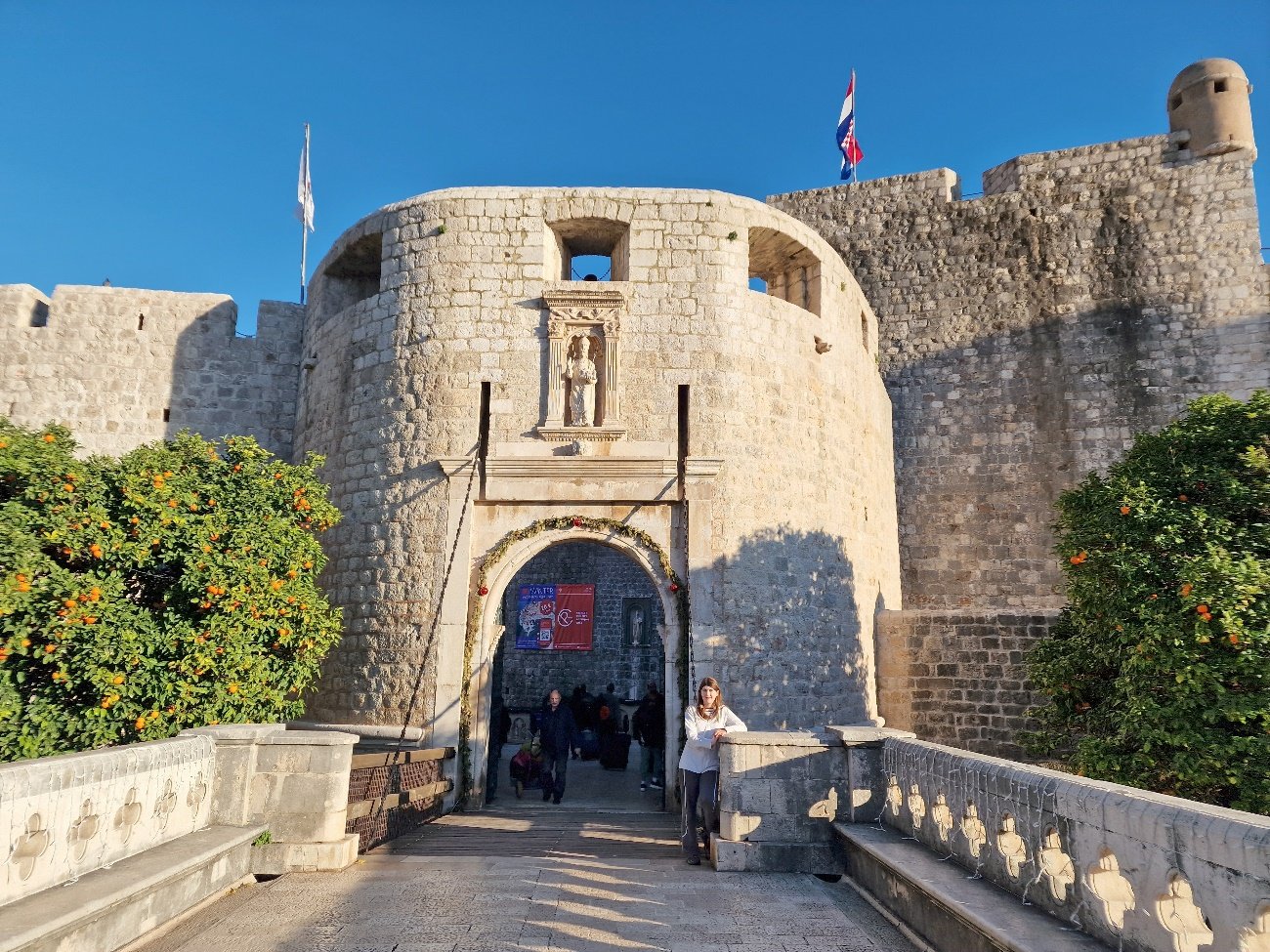 Puedes subir a las murallas y recorrerlas. Algo muy recomendable ya que dicho recorrido ofrece vistas espectaculares del azul intenso del mar Adriático, de las torres defensivas de las murallas y, por supuesto, a todos los tejados del centro histórico de Dubrovnik.