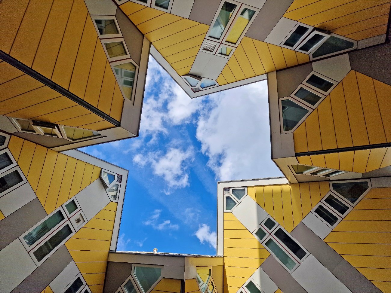Como muestra de ello, destacaremos las Casas Cúbicas, unas originales viviendas inclinadas a 45º, de color amarillo.