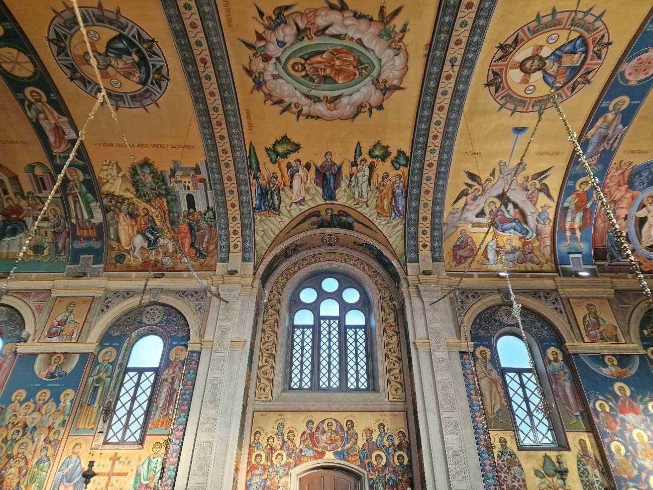 El templo destaca por su belleza arquitectónica y por su bonito interior lleno de color, decorado con frescos y murales que representan escenas bíblicas.